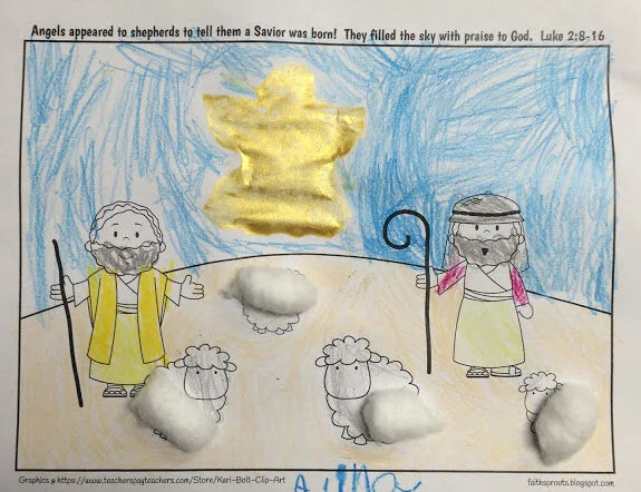 Draw an angel in the sky and use cotton balls to glue onto the sheep.